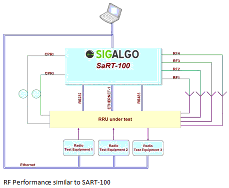 SIGALGO SaPT-100 is a Base Station - BTS - emulator for use in a Production Test Environment. The SaPT is a key part of the Automated Test Environment for the production of Remote Radio Heads - RRHs. The SaPT-100 is available for 3G and 4G air interfaces and can be customised to meet our customers' specific test requirements. The default configuration is with 4Tx/4Rx allowing either 2 2x2 RRH or 1 4x4 RRH to be tested at the same time. The Digital interface is customised to match our customers specific I&Q mapping interface.